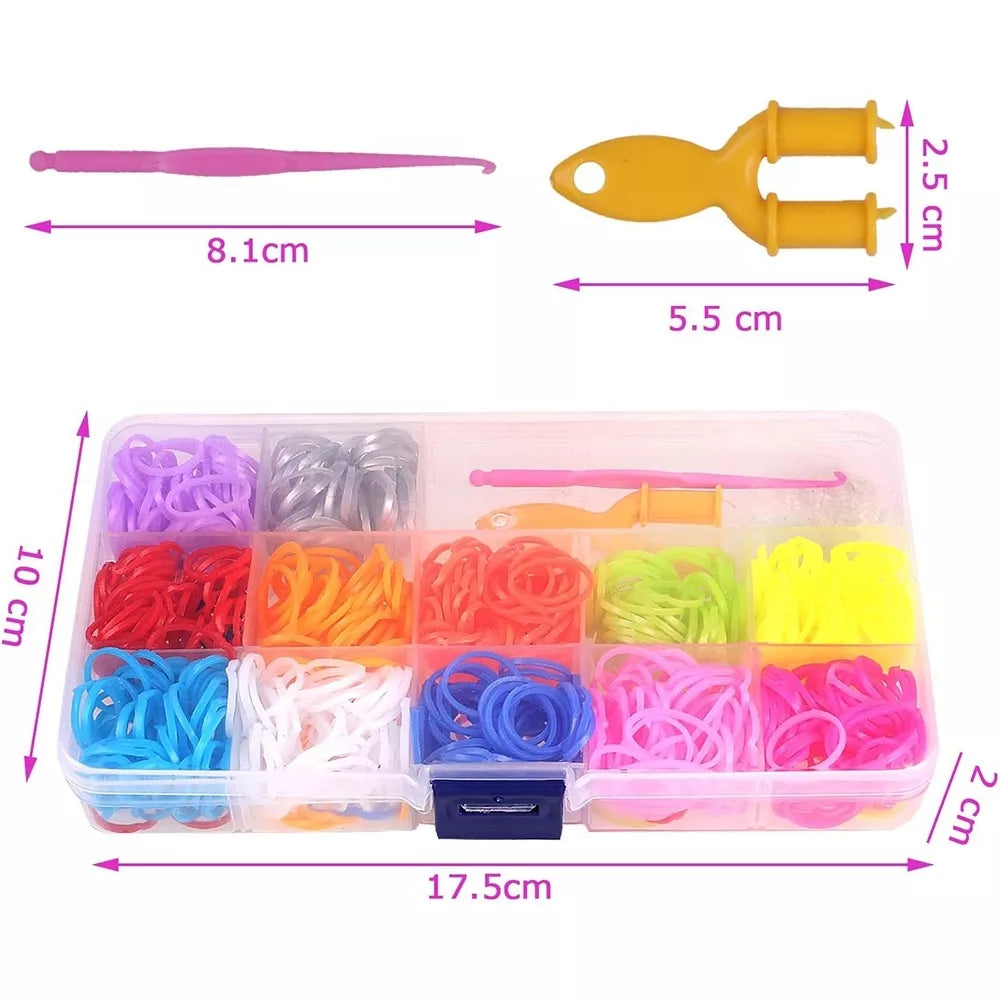 „Pilnas“ spalvotų apyrankių pynimo rinkinys su pynimo staklytėmis, sujungimais, vašeliu, 600vnt gumelių ir dėžute.