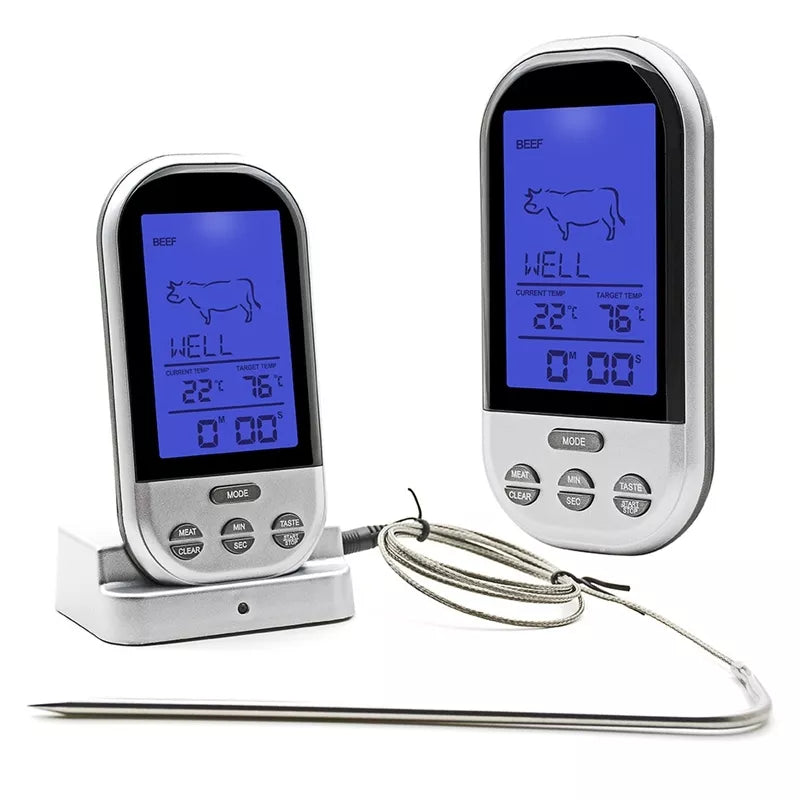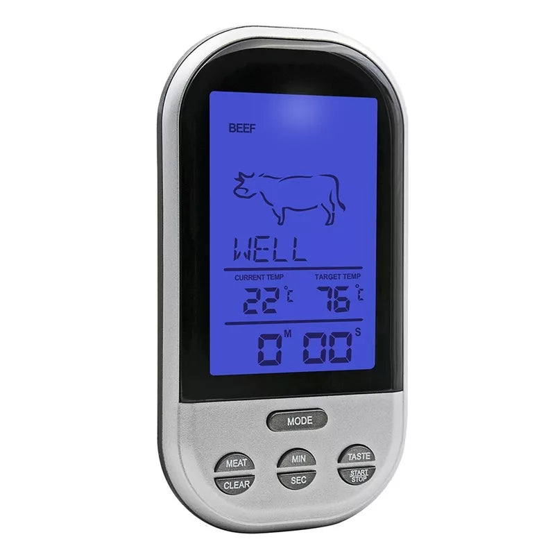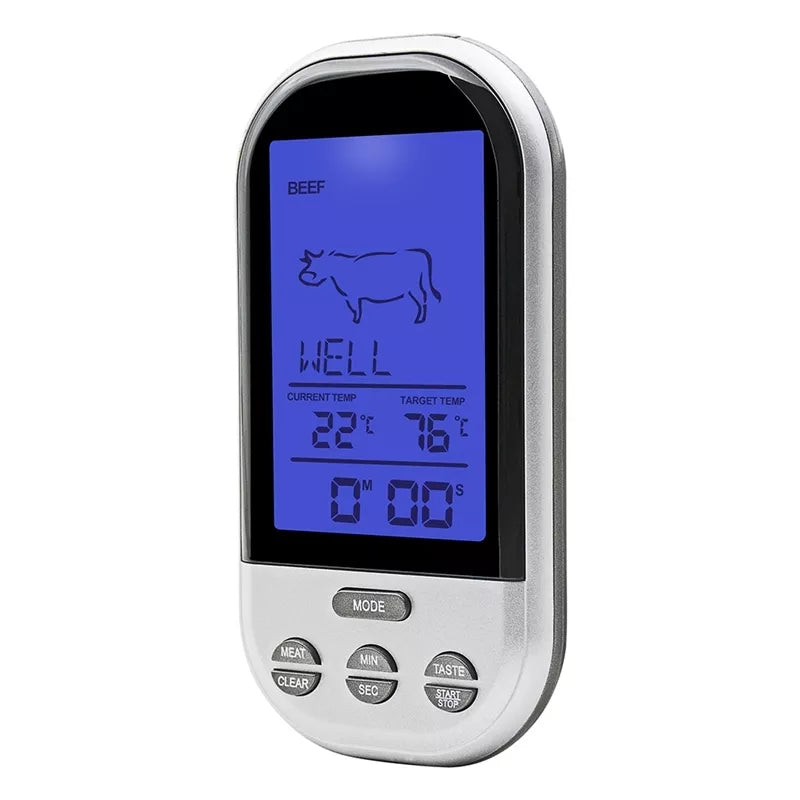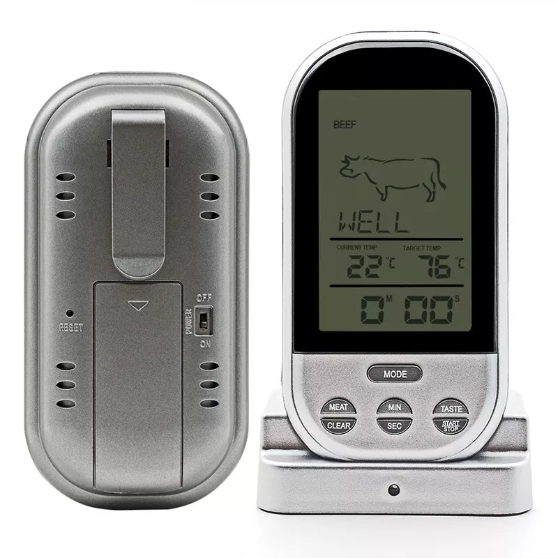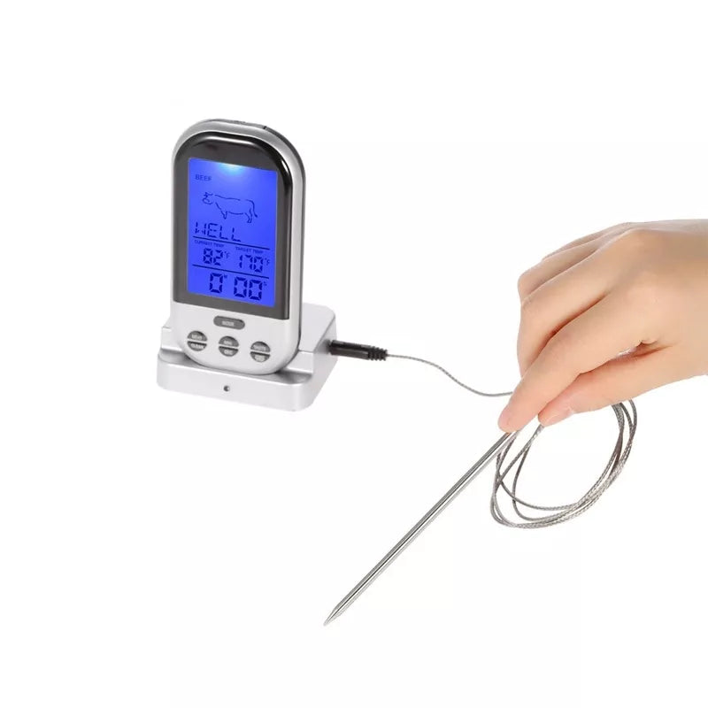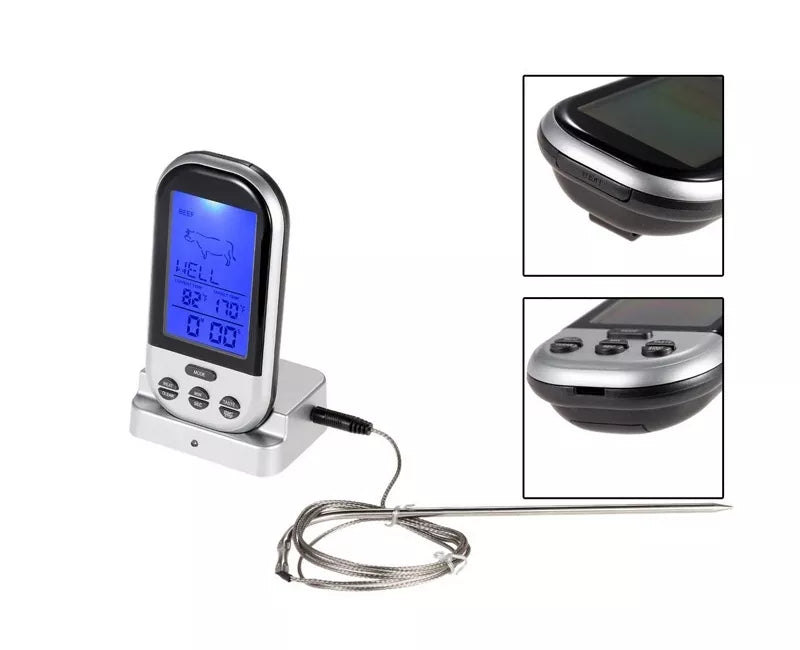 Belaidis, stotelės veikimo atstūmas iki 30 metrų;Termometras ir zondas pagamintas iš nerūdijančio plieno;Laido ilgis: 100 cm + 18 zondas;Įspėjamasis signalas, kaip pasiekta nustatytą temperatūra ar laikas;Laikmačio diapazonas: max. 99 min 59 sek.;Zondo ilgis: apie 18 cm;Zondo temperatūros diapazonas: 0 °C iki 250 °C (32 °F iki 482 °F);Veikia su baterijomis: 2 x AAA (stotelė) ir 2 x AAA zondo daviklis (elemnetai nepridedami);Matmenys: 62 x 26 x20mm