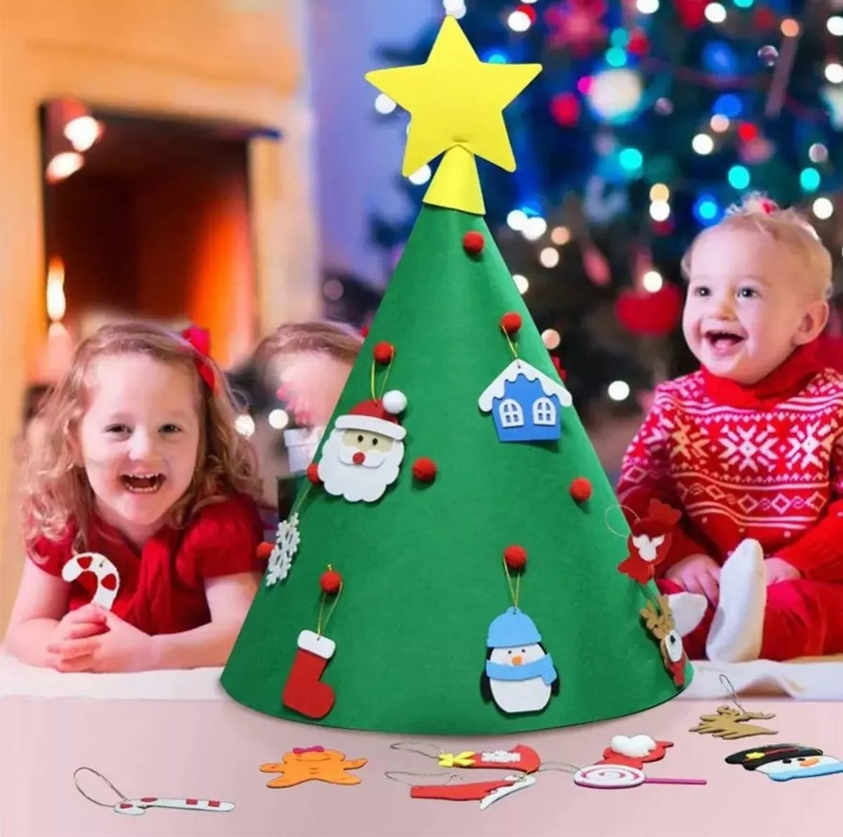 3D veltinio Kalėdų eglutė vaikams. Puikus žaislas, lavinantis vaikų kūrybiškumą. Aprūpinta įvairiais nuimamais papuošalais, kuriuos galima pritvirtinti ir nuimti bet kurioje eglutės vietoje. Pagaminta iš lengvos ir saugios medžiagos (veltinio). Sukurta dėti ant paviršiaus. Specialus pakabukas taip pat leidžia pakabinti ant sienos.