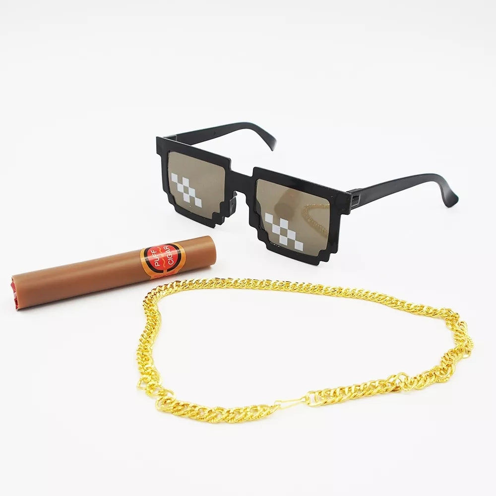 Komplektacija:Stilingi pikseliniai akiniai su juodais rėmeliais ir šachmatiniu raštu – tikro „Thug Life“ įvaizdžio akcentas.Žaislinė cigaro imitacija, kuri suteikia šmaikštumo ir užbaigia kostiumą.Blizganti „auksinė“ grandinėlė – tikras prabangos simbolis.Medžiagos: Kokybiškos ir saugios vaikams, patogios dėvėti.Paskirtis: Puikiai tinka vakarėliams, gimtadieniams, karnavalams ar fotosesijoms.Šis rinkinys garantuos daug juoko ir geros nuotaikos.