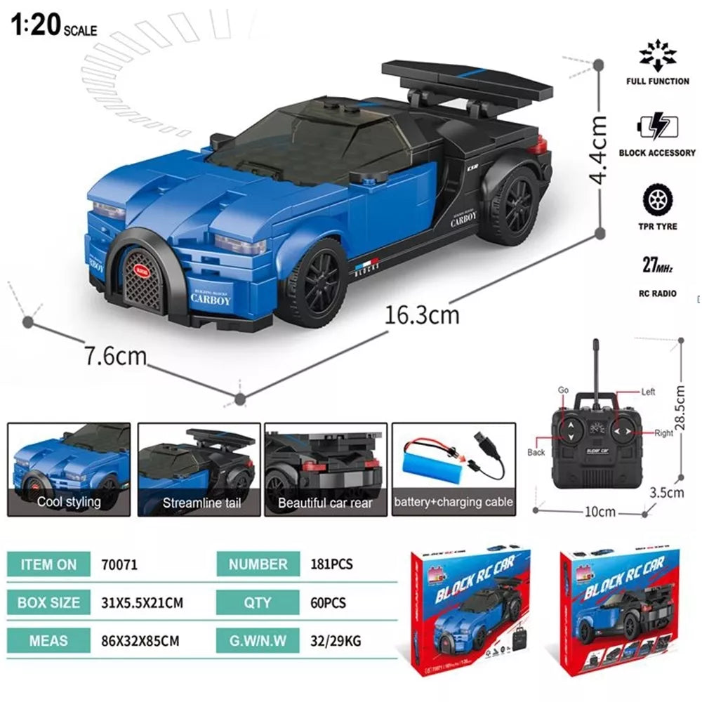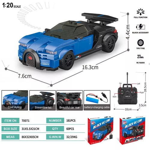 Automobilis pagamintas masteliu 1:20, turi sportišką dizainą, plačią galinę dalį ir detalių tikroviškumą. Tai puiki dovana vaikams, mėgstantiems konstruoti ir lenktyniauti su mašinomis.