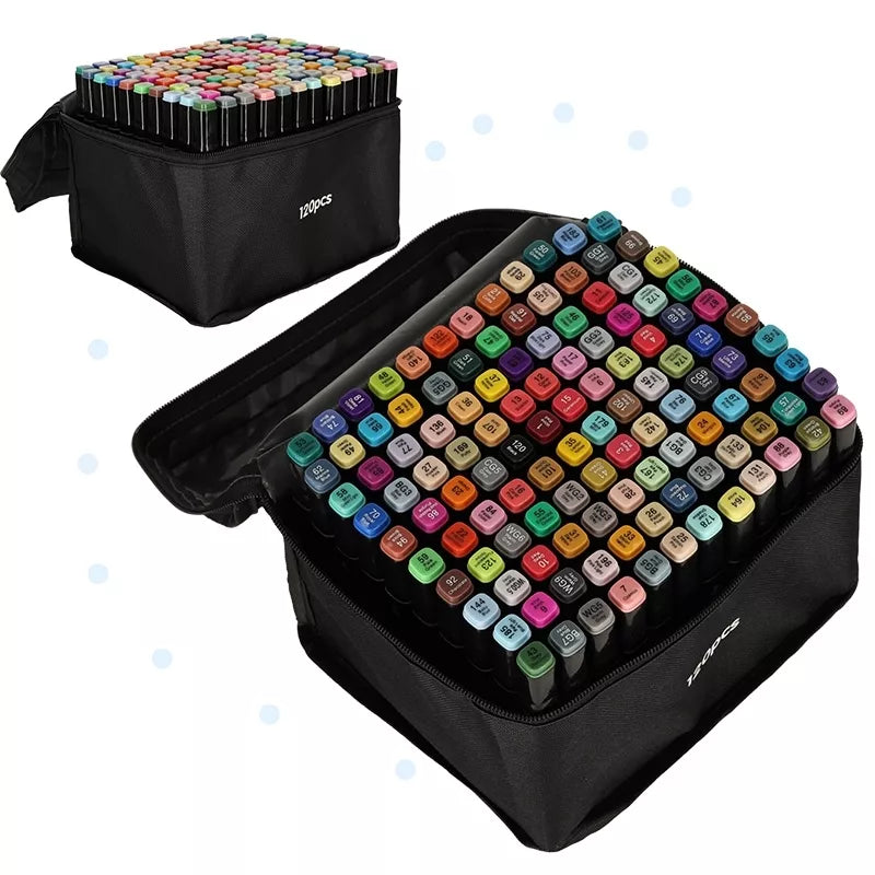 120 dvipusių alkoholio pagrindo markerių rinkinys su stovu ir dėklu – spalvų pasaulis, įkvėpsiantis kūrybai!