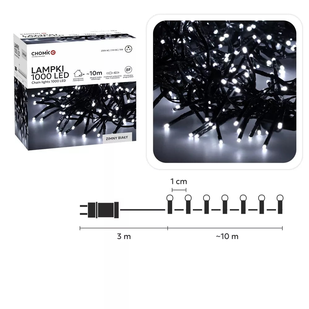 CHOMIK 1000 LED šaltai balta girlianda – tai aukštos kokybės, ilgaamžis ir saugus šviesos sprendimas, sukuriantis įspūdingą žiemos pasakos atmosferą tiek namuose, tiek lauke.