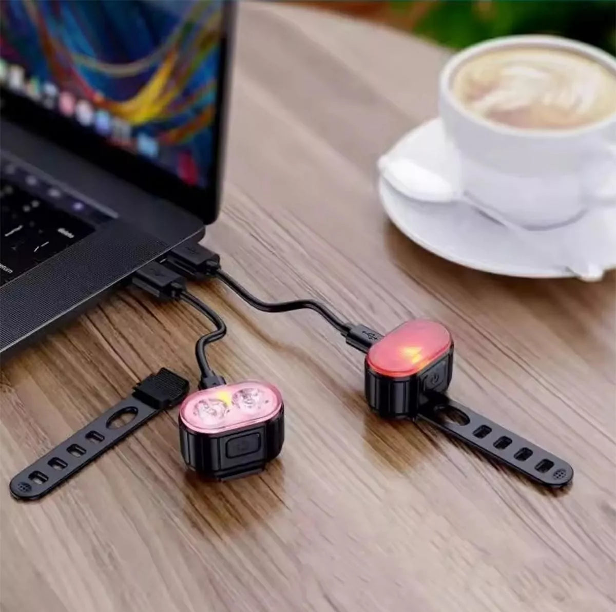 Dviračio žibintų rinkinys, susidedantis iš priekinio ir galinio žibinto. Jame naudojama energiją taupanti LED technologija, kuri taip pat daro mus geriau matomus tamsoje. Integruotų baterijų ir pridedamų USB įkrovimo laidų naudojimas garantuoja sklandų naudojimą ir nereikia nuolat keisti baterijų. Patogios, universalios rankenos (kabliukai) užtikrina be rūpesčių kiekvienos lempos surinkimą ir išmontavimą.