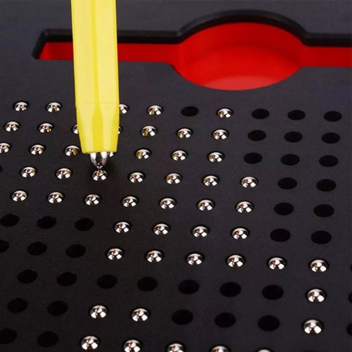 Judindami įmagnetintą rašiklio galiuką virš lentos skylių, rutuliai nusėda ir sudaro piešinį.