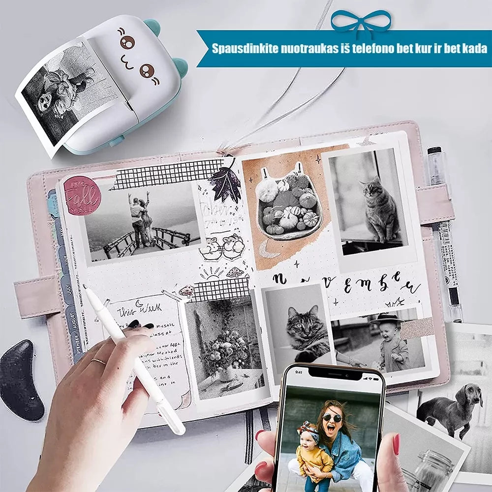 Mini spausdintuvas.Terminio popieriaus ritinys.USB laidas įkrovimui.Papildomai galima įsigyti: