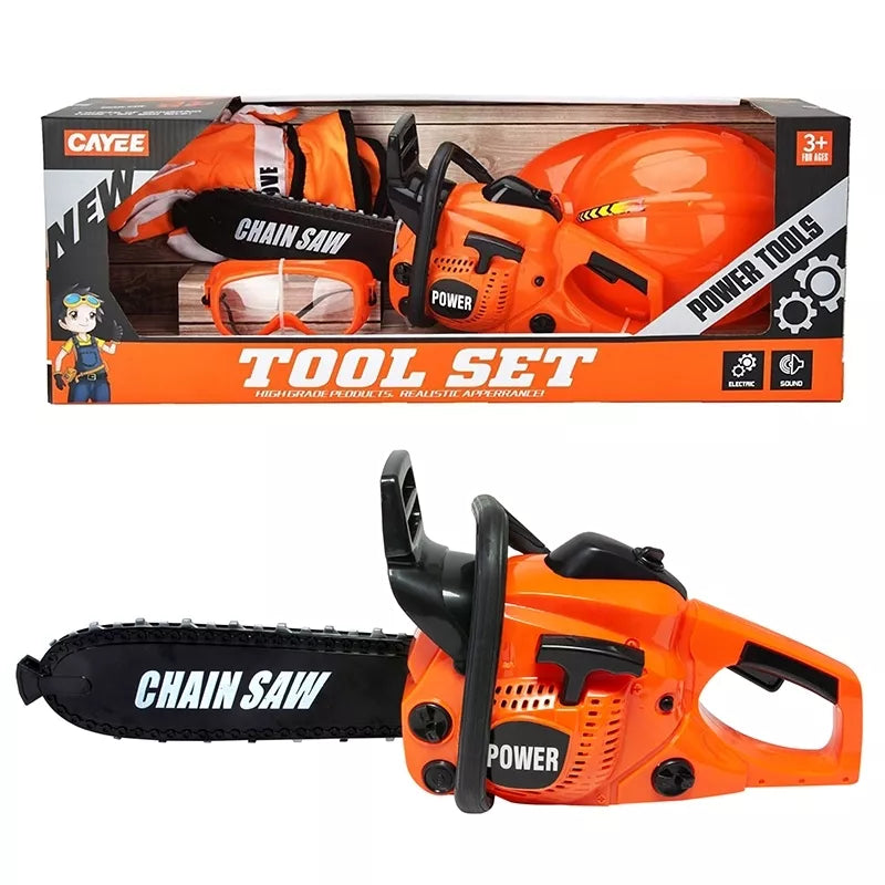 Tobulas komplektas pradžiugins kiekvieną mažą berniuką, kuris galės atlikti suaugusio ir stipraus medkirčio vaidmenį! Berniukas galės žaisti kirsdamas medžius ar pjaudamas malkas židiniui. Rinkinys yra visiškai saugus vaikams ir leis jiems laisvai žaisti. Pjūklo šone yra mažas juodas mygtukas, leidžiantis paleisti pjūklą. Patraukus rankenėlę kairėje pusėje, išgirsime tikro pjūklo užvedimo garsą, o paspaudus gaiduką ant kreipiančiosios juostos pritvirtinta grandinė pradeda suktis kaip tikrame pjūkle ir taip pat skleidžia besisukantis pjūklas! Mažas berniukas jausis tikru medkirčiu!