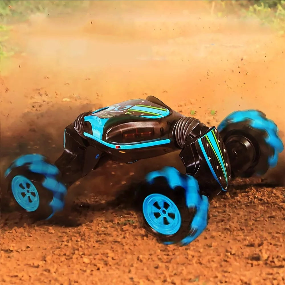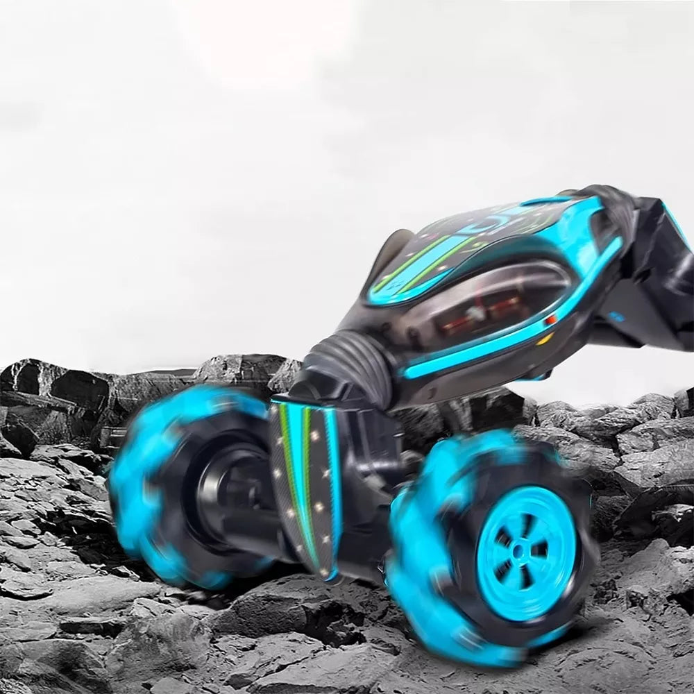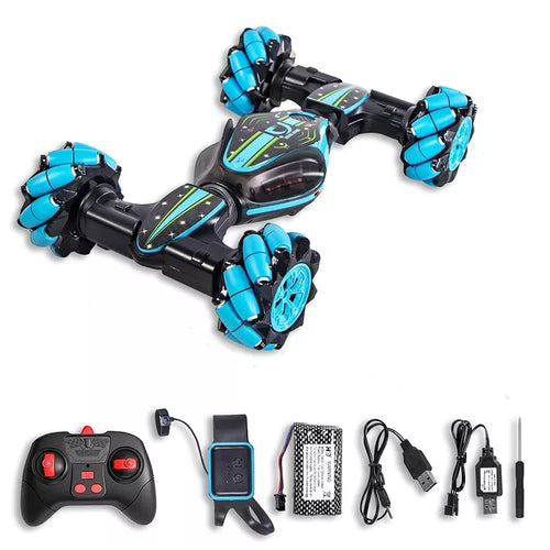 Unikalus žaislas, tinkantis ir vyresniems vaikams! Radijo bangomis valdomas automobilis, važiuojantis visomis kryptimis. Komplekte yra du nuotolinio valdymo pultai: tradicinis pultelis ir apyrankė, leidžianti valdyti automobilį gestais – Abu pulteliai veikia 2,4 GHz dažniu. Automobilyje yra 4 ratai, kurie sukasi į visas puses. Transporto priemonė nuo sustojimo gali judėti pirmyn, atgal, dešinėn ir kairėn. Dėl didelio sukibimo jis įvažiuos į reljefą net 45 laipsnių nuolydžiu. Automobilis turi du režimus: lenktyninį ir visureigį. Vienu mygtuku galite pakeisti jo režimą, taigi ir formą. Lenktynių režimu jis išvysto didesnį greitį. Bekelės režimu jis nebijo nei pakilimų, nei kliūčių. Jis gali įveikti žolę ar smėlio reljefą. Šviesos efektai ant ratų. Prieš naudodami atsukite akumuliatoriaus apsaugą automobilio kėbule ir prijunkite laidus. Laikas lenktyniauti!
