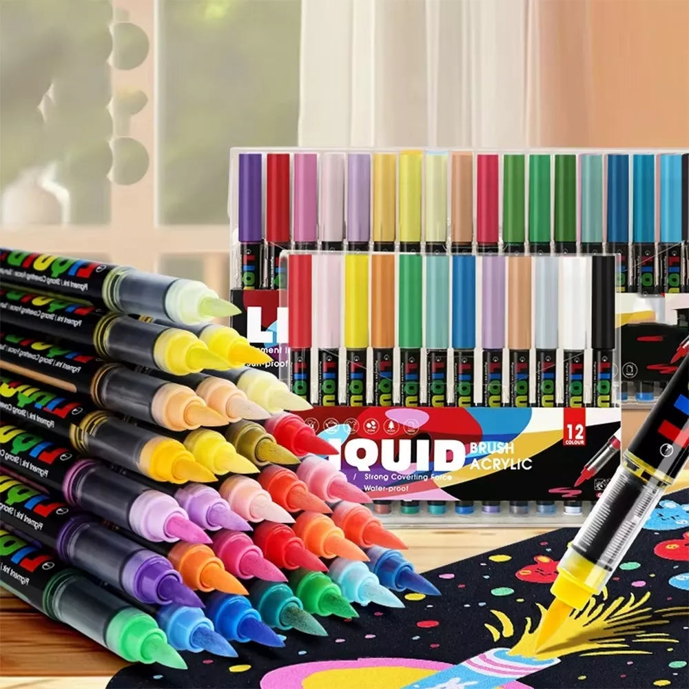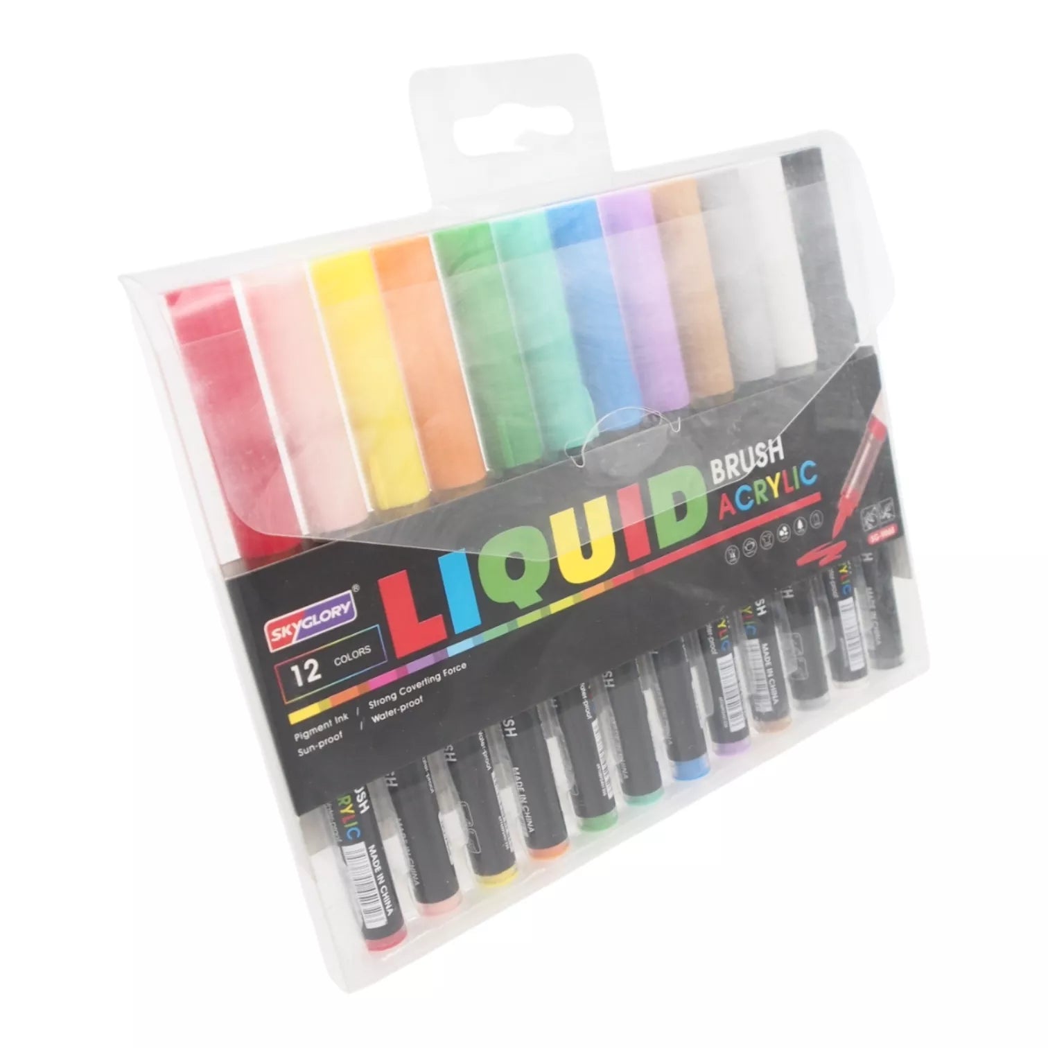 Akriliniai skysti teptukų tipo markeriai „SkyGlory“ – 12 ryškių spalvų kūrybai be ribų!
