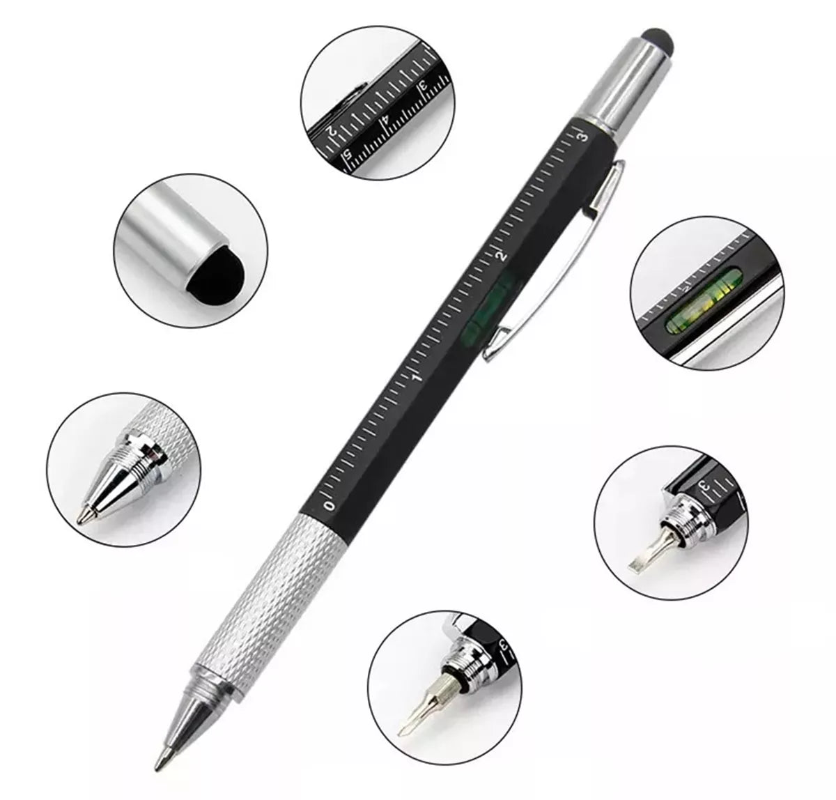 Daugiafunkcis rašiklis - 6in1 daugiafunkcis įrankis. Rašiklis aprūpintas daugybe naudingų niekučių, tokių kaip rašiklis jutikliniams ekranams, gulsčiukas, liniuotė, atsuktuvas ir saugykla smulkiems daiktams.