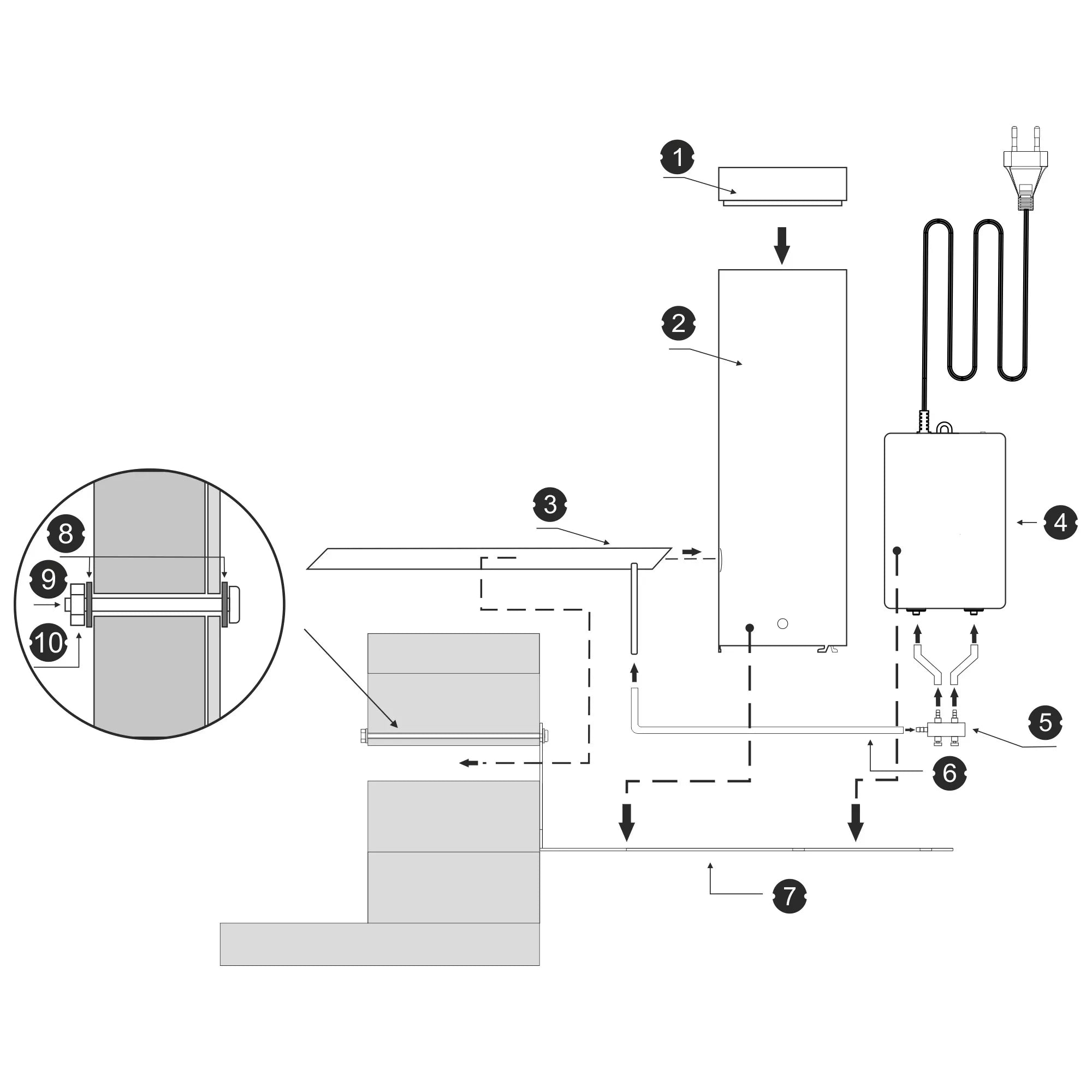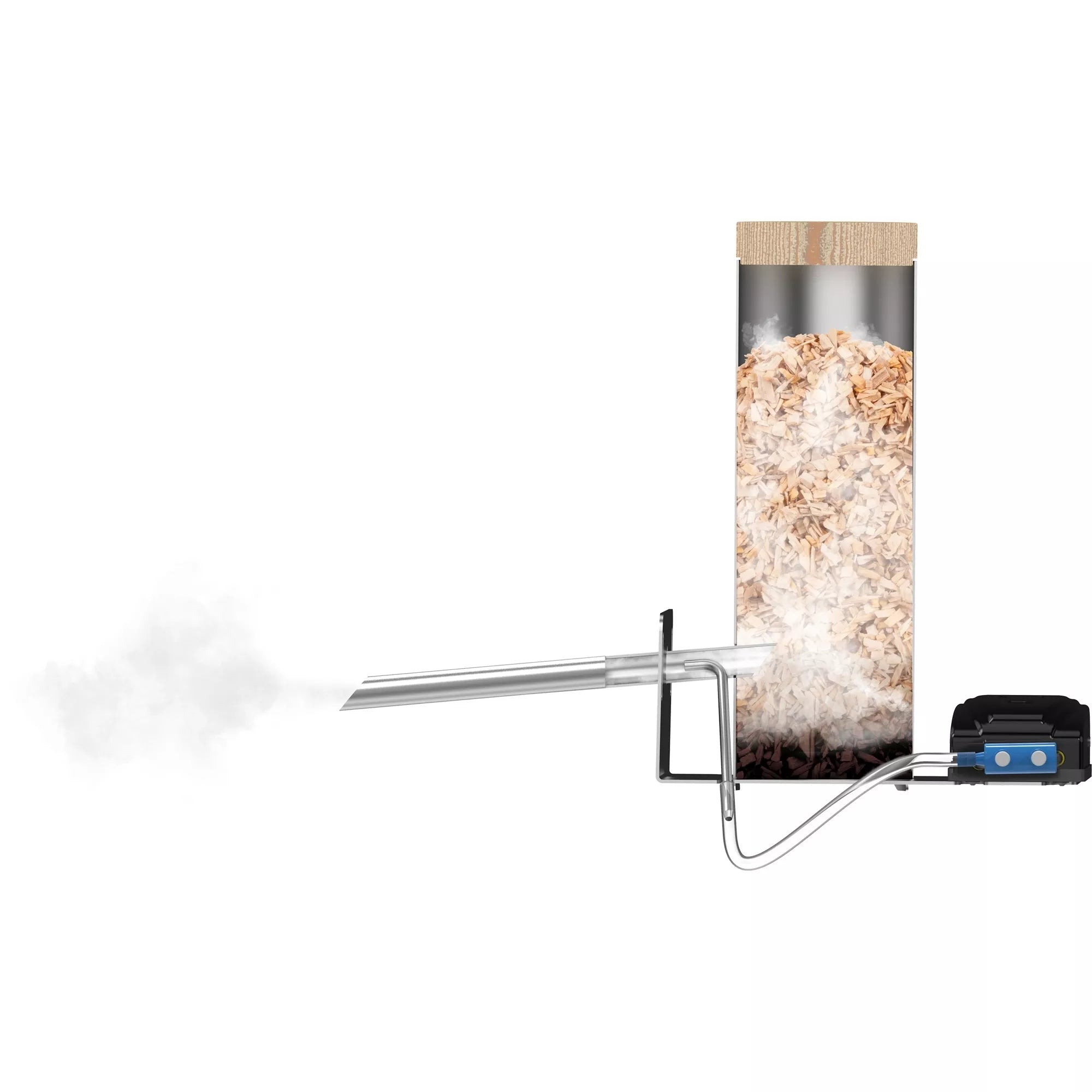 medinis dangtelisdūmų generatoriaus cilindras (tiekimo kameros korpusas), pagamintas iš nerūdijančio plieno 304elektrinis siurblys (5 W)generatoriaus antgalis su vamzdeliunerūdijančio plieno montavimo pagrindasjungčių rinkinys (T formos dalis, vožtuvas, silikoninės žarnos)M8 nerūdijančio plieno poveržlė - 4 vntM8x40 nerūdijantis varžtas - 2 vnt (jei sienelės storis 3 cm; jei sienelės storis didesnis, būtina naudoti atitinkamo tipo varžtus)M8 nerūdijanti veržlė - 2 vntvartotojo vadovaspakelis medienos drožlių rūkymui