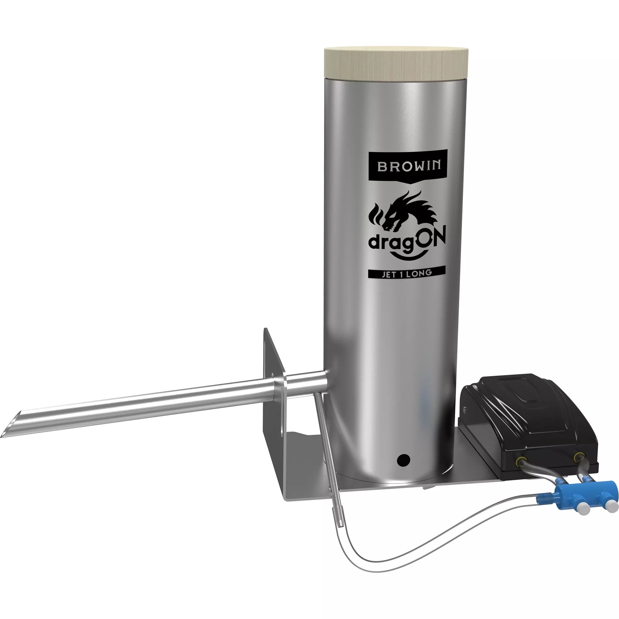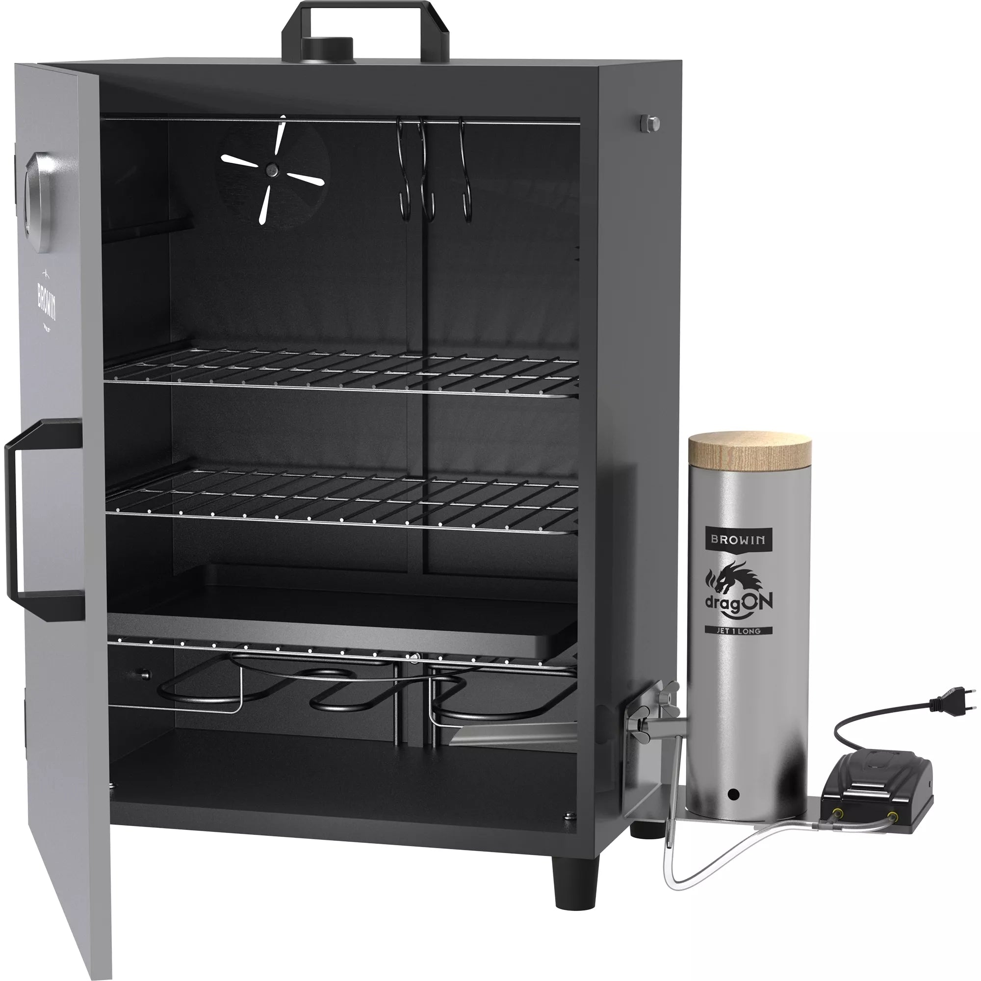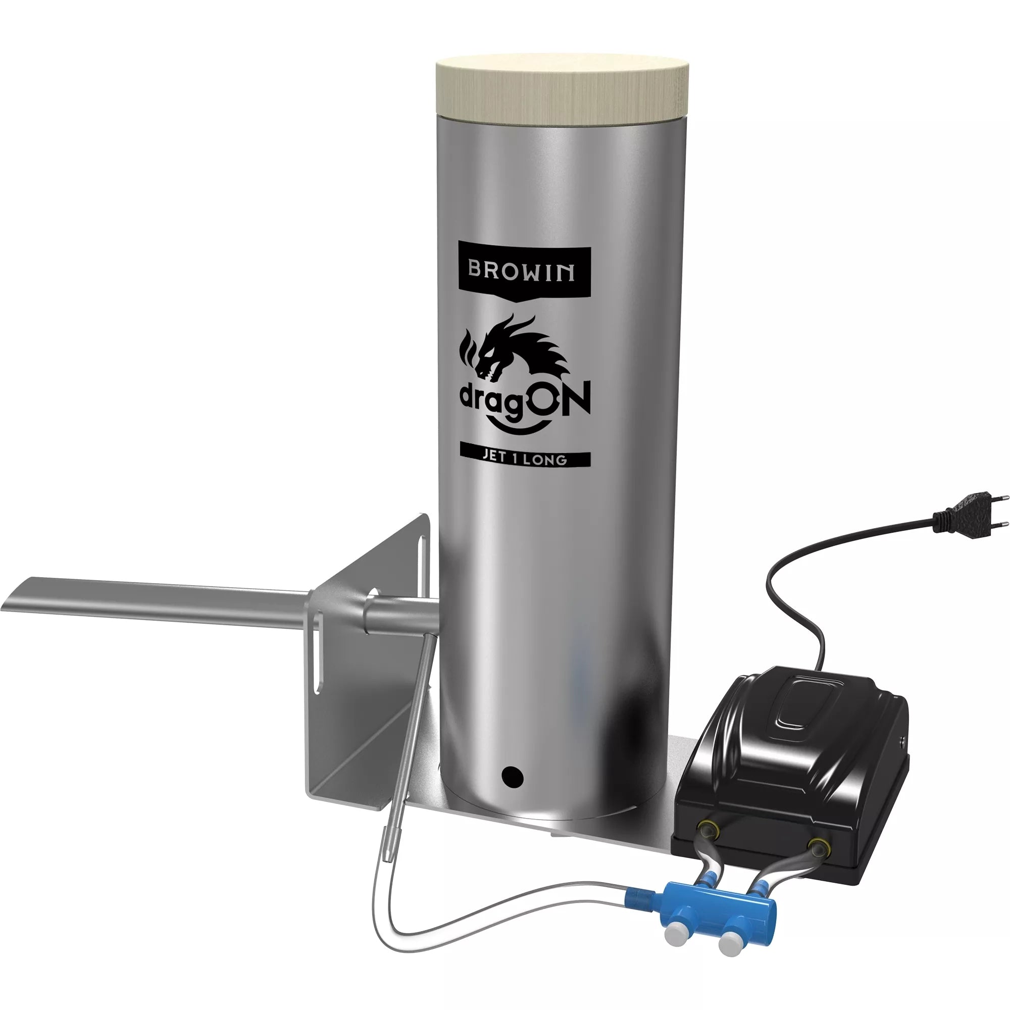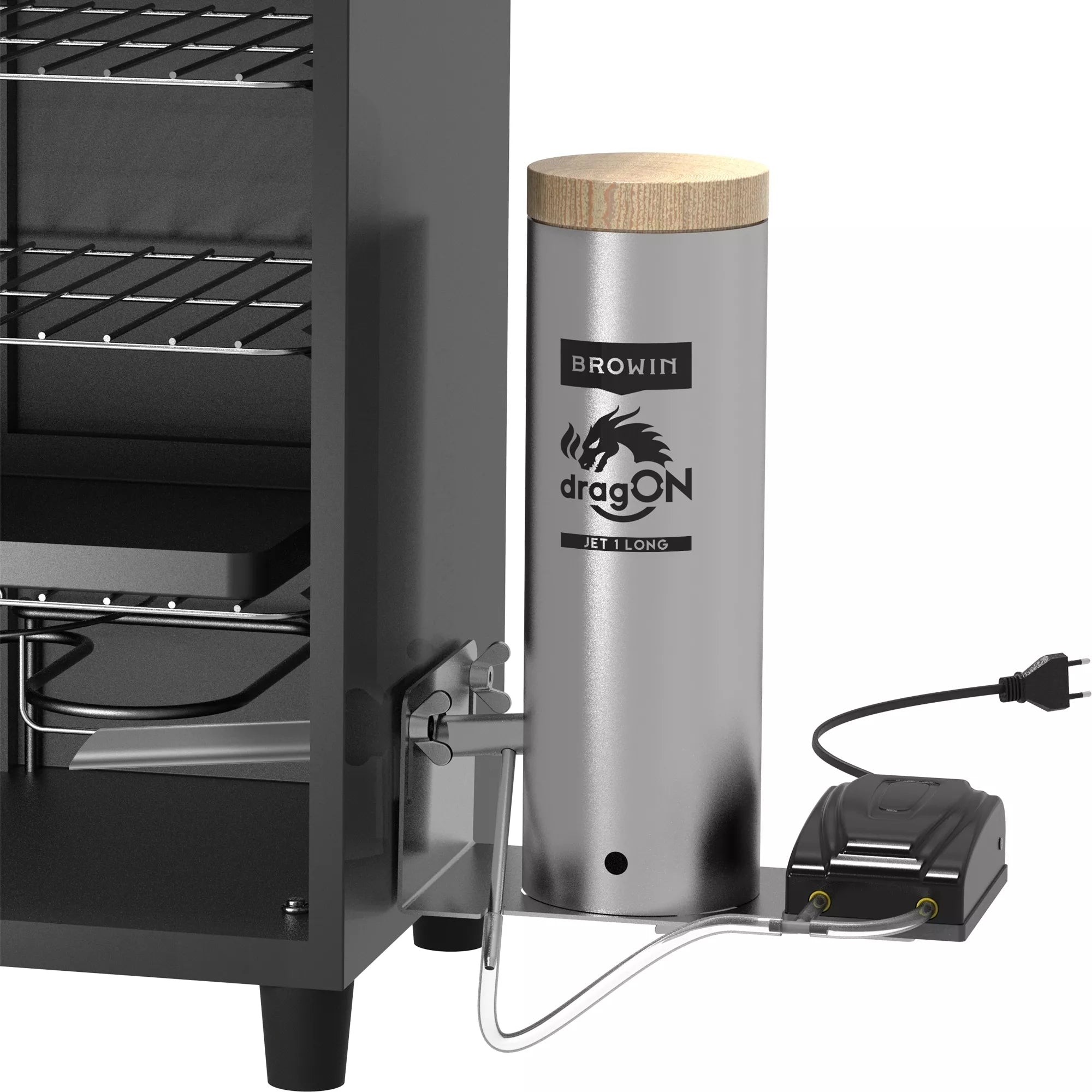 Dūmų generatorius rūkykloms "dragON Jet 1"Dūmų generatorius, tinkantis naminių rūkytų gaminių entuziastų poreikiams, ieškantiems galimybės sukurti skanią ir aromatingą mėsą, žuvį ar sūrį. Dūmų generatoriaus naudojimas užtikrina puikią rūkymo proceso kokybę ir efektyvumą. Naudojant šį naujovišką dūmų generatorių, šaltas ir šiltas / karštas rūkymas bus efektyvus ir stilingas būdas gauti profesionaliai rūkytų produktų.Generatorių galite montuoti ant didelės arba mažos rūkyklos. Bandymai buvo atlikti su 300 l talpos rūkykla.Inovatyvus dūmų generatoriaus antgalis - jo konstrukcija su atitinkamai nuožulniais galais, specialiu kampiniu vamzdžiu ir prijungiama pompa užtikrina puikų, tolygų dūmų pūtimą į rūkyklą ir aukštą efektyvumą su mažomis drožlių sąnaudomis. Antgalis įkišamas į rūkyklą tokiu kampu, kuris padidina dūmų srautą ir padeda sumažinti nuosėdų, užkimšančių tipiškus vamzdžius, kaupimąsi, kai medienos drožlės dega lėtai. Oro įpurškimo siurblys per žarną prijungiamas prie kampinio vamzdžio, integruoto su antgaliu.Paprastas montavimas ir išmontavimas – naudojami konstrukciniai sprendimai leidžia greitai ir lengvai prijungti generatorių prie rūkyklos ir paruošti naudojimui (taip pat ir išmontuoti). Tuo pačiu užtikrinamas tinkamas prietaiso sandarumas gaminant dūmus.Talpus korpusas (vamzdis) - leidžia į generatorių įdėti apie 450 g medžio drožlių. Tokio medžio drožlių kiekio pakanka kelioms valandoms rūkyti jų nepildant.Lengvas valymas – dūmų generatorių galima lengvai išardyti ir išvalyti, neatsukant jo pagrindo nuo rūkyklos ir nenaudojant jokių įrankių.Didelio našumo elektrinis siurblys su oro srauto valdymu optimizuoja medienos drožlių deginimo efektyvumą – pamirškite apie pakabintą skiedrą! Dėl siurblio padėties ant tam skirto tvirtinimo pagrindo siurblio generuojamos vibracijos tiesiogiai perduodamos į degimo kamerą, todėl degimo proceso metu pagerėja drožlių nusėdimas.Pagal poreikį generatorius gali būti montuojamas iš abiejų rūkyklos pusių.Dūmų generatoriuje sumontuotas 5 W elektrinis juodos spalvos siurblys, kurio našumas 2x3,5 L/min.Jo apgalvota, patentuota konstrukcija leidžia derinti mažą generatoriaus formos koeficientą su dideliu efektyvumu, mažu medienos drožlių suvartojimu ir galimybe reguliuoti dūmų kiekį, susidarantį naudojant siurblį pagal savo poreikius ir rūkymo kameros talpą. Dūmų generatorius pagamintas iš aukštos kokybės nerūdijančio plieno, todėl jį galima naudoti rūkant įvairiomis oro sąlygomis. Korpusas (įkrovimo cilindras) uždaromas mediniu dangteliu, kuris užtikrina tinkamą dūmų cirkuliaciją ir apsaugo drožles degimo proceso metu (pvz., nuo lietaus lašų). Ilgą (4 m) žarną galima supjaustyti į dalis, reikalingas siurbliui prijungti prie dūmų generatoriaus antgalio.