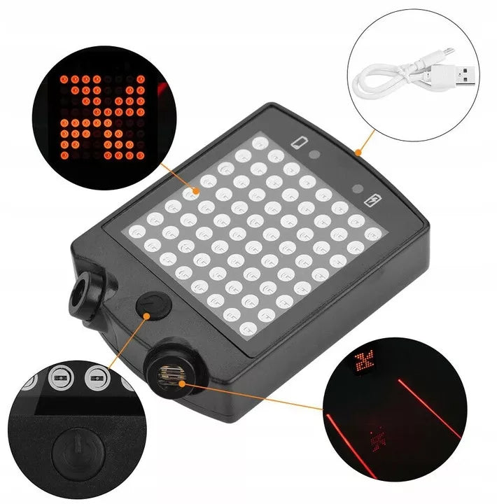 Dviračio belaidis LED žibintas su indikatoriaus funkcija ir lazeriniu projektoriumi. Prietaisas sumontuotas ant dviračio sėdynės atramos. Žibintas žymiai padidina kelių eismo saugumą, signalizuodamas apie krypties pasikeitimą ir nustatydamas saugią zoną lazerio projekcija.