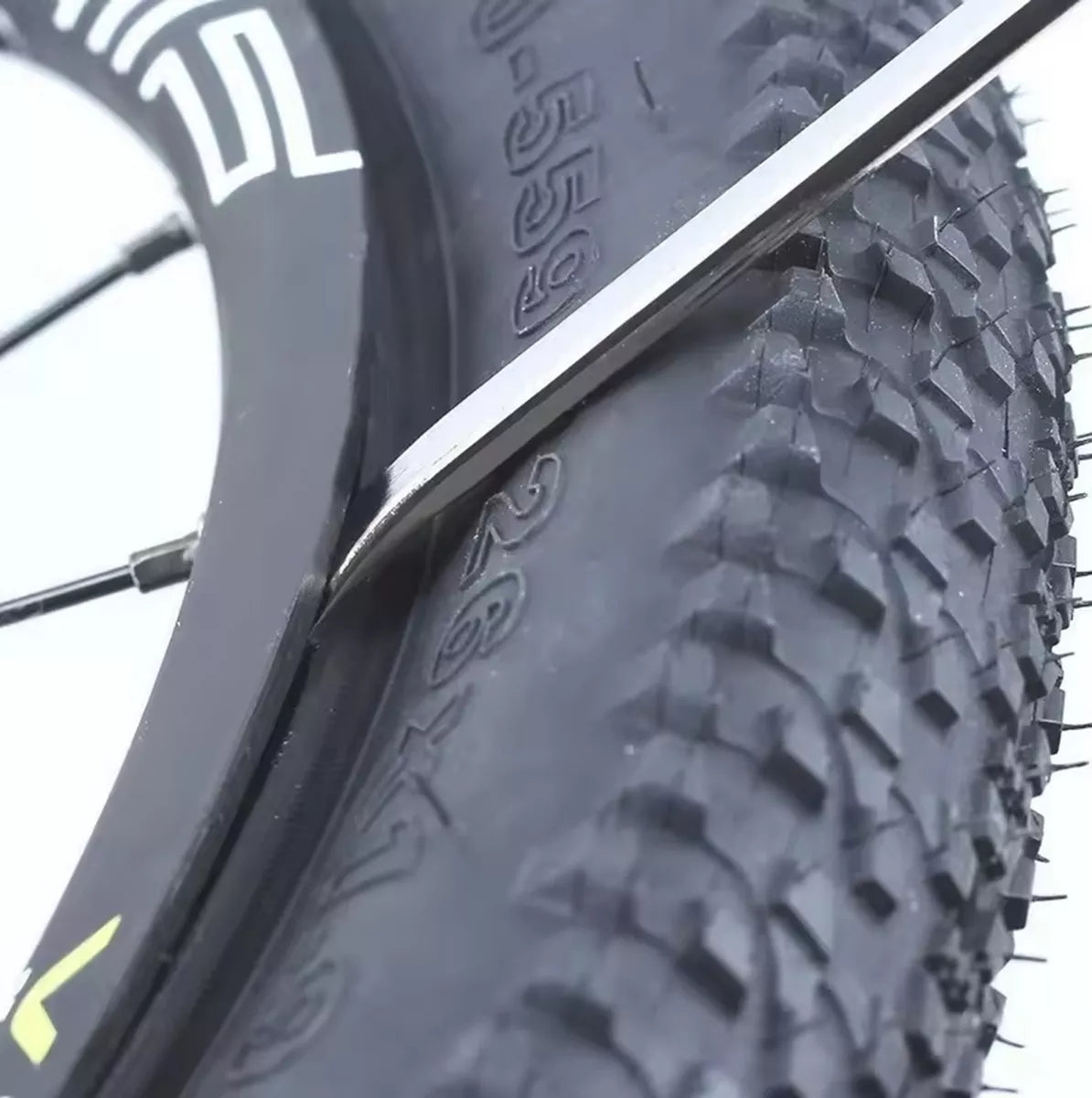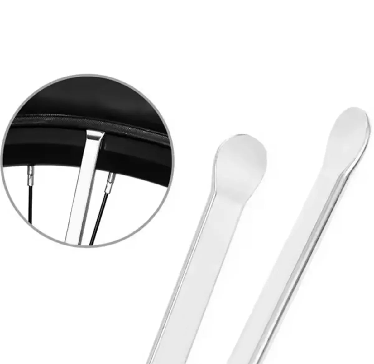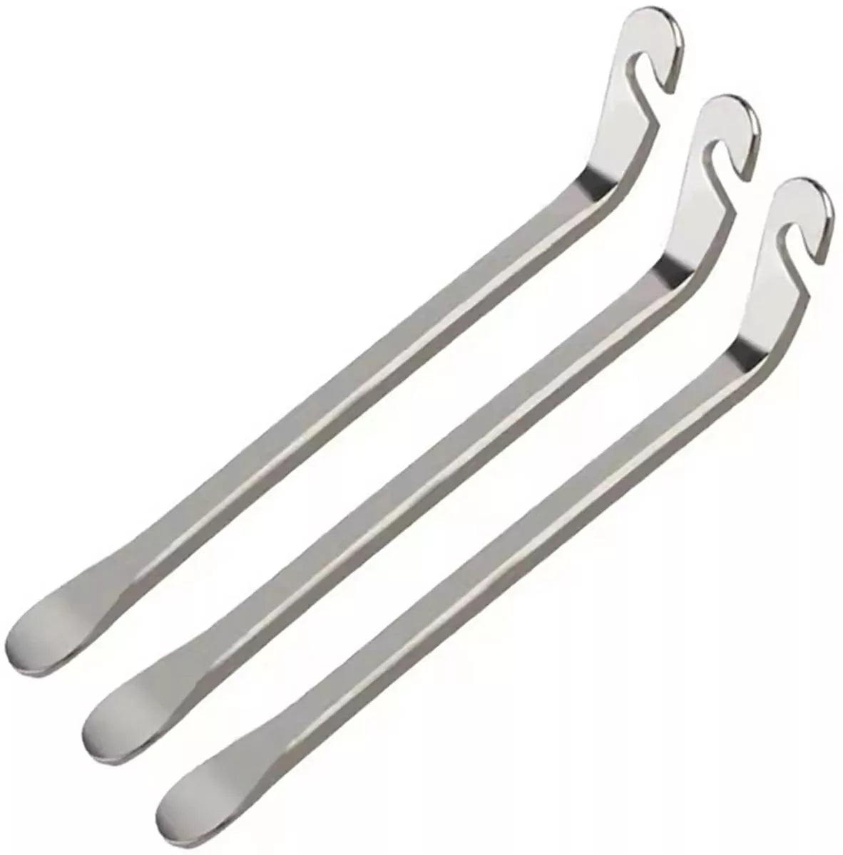 3-jų plieninių įrankių rinkinys dviračio padangoms nuimti. Tvirta konstrukcija (metalinė) užtikrina ilgą naudojimą. Lygūs kraštai apsaugo nuo atsitiktinio padangų ir ratlankių pažeidimo. Speciali perforacija leidžia užkabinti šaukštą prie stipino, ir palengvina darbą.
