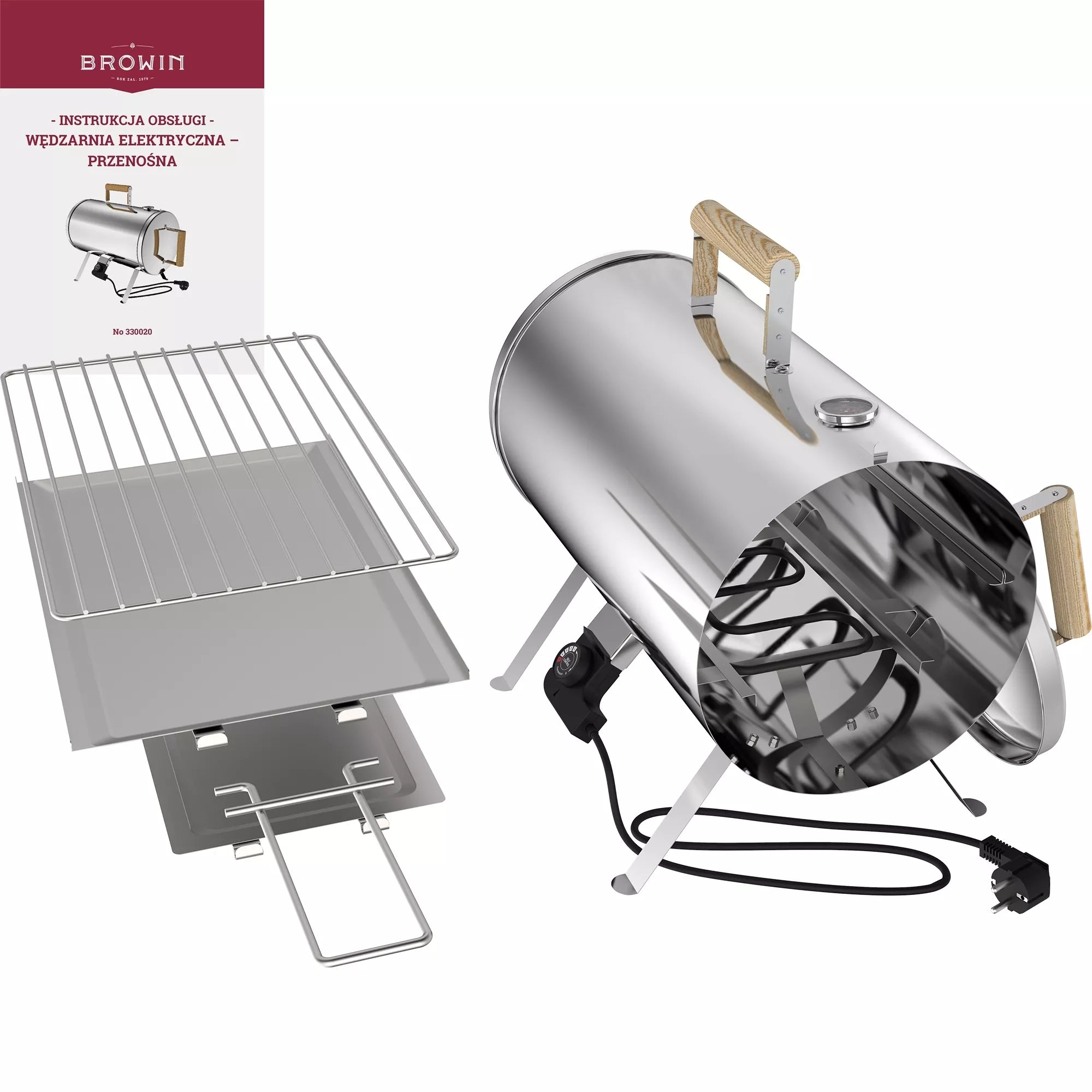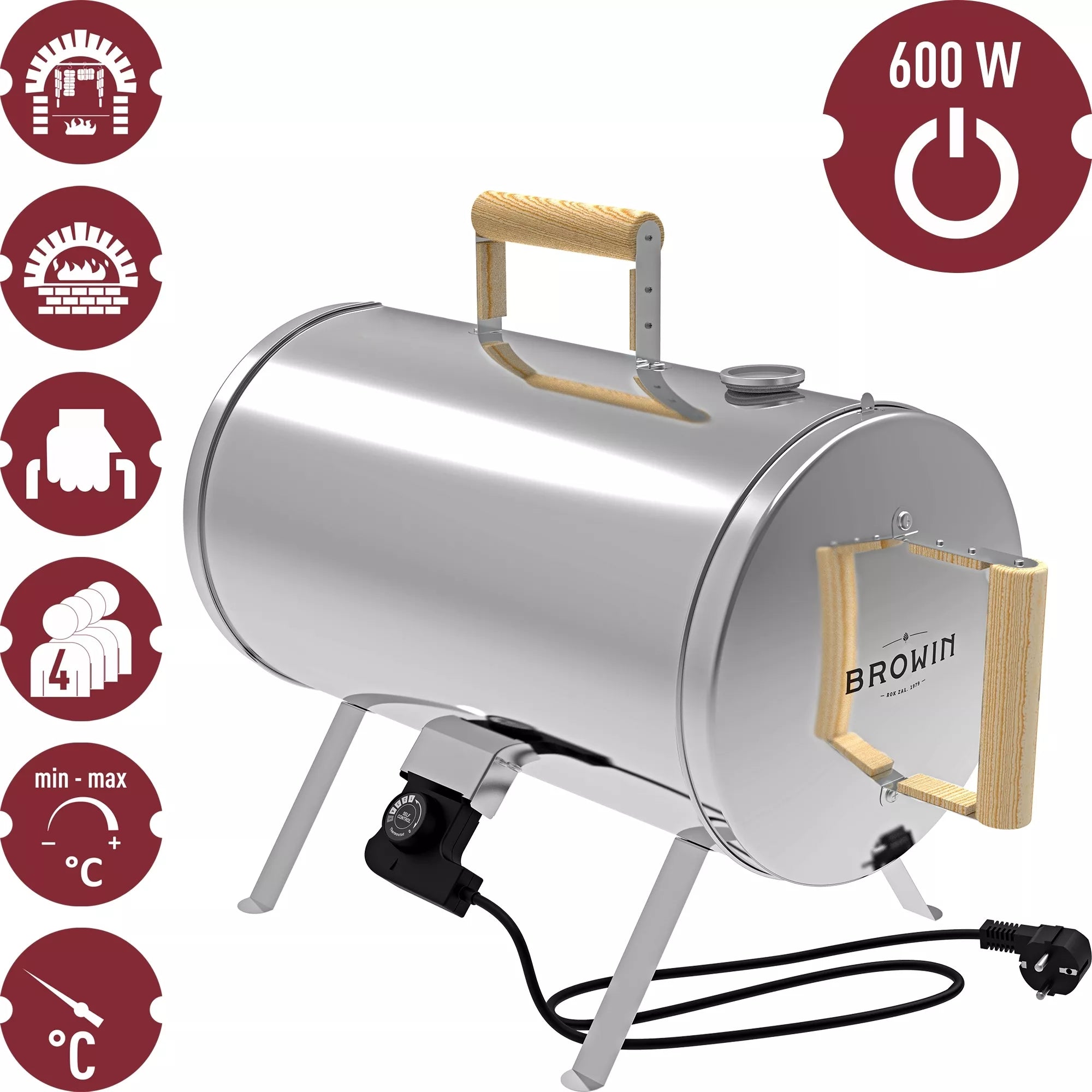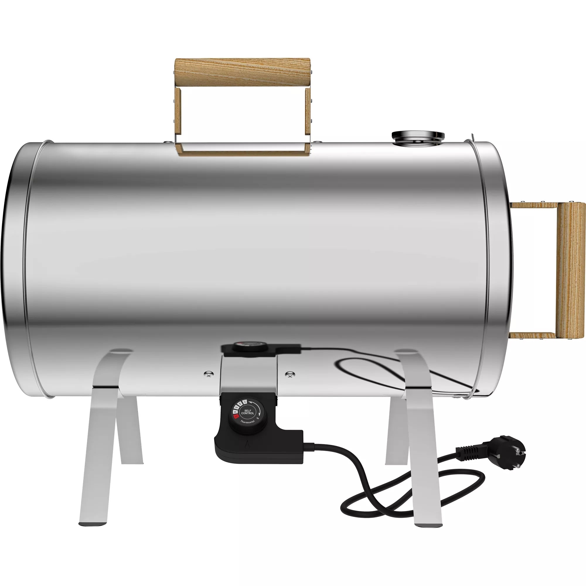 Elektrinė kelioninė rūkykla, 600W​Rūkymui ir kepimui – elektrinė rūkykla be skiedrų taip pat gali būti naudojama kaip orkaitė.Lengva nešioti ir naudoti – dėl dydžio, svorio ir nešiojimo rankenos įrenginį lengva perkelti. Rūkyklą nesunkiai pasiimsite su savimi į kelionę.Puiki oro cirkuliacija – cilindro forma užtikrina geresnę oro cirkuliaciją ir efektyvesnį karšto oro paskirstymą nei stačiakampėse rūkyklose.Temperatūros valdymas - rūkykloje yra 600 W šildytuvas su termostatu temperatūros kontrolei. Temperatūrą galima reguliuoti įmontuotu termometru.Saugus naudoti – rūkykloje yra medinė rankena, kuri rūkymo metu neįkaista. Pridedama metalinė rankena leidžia saugiai išimti karštas groteles ir drožlių dėklą.Aukštos kokybės medžiaga – rūkykla pagaminta iš geros kokybės nerūdijančio plieno. Tai reiškia, kad jūsų įranga tarnaus daugelį metų.Universali elektrinė rūkykla, pagaminta iš nerūdijančio plieno, leidžia kepti vienu metu su galimybe patiekalams suteikti dūmo aromatą. Greitai ir paprastai galite rūkyti paukštieną ir kitas mėgstamas mėsos, žuvies ir daržovių rūšis.Rūkymas yra puikus būdas išsaugoti maistą, t. y. pratęsti jo galiojimo laiką.Tai įrenginys, kurį galite lengvai perkelti bet kur arba pasiimti su savimi į kelionę. Norint rūkyti ar kepti, tereikia elektros tiekimo ir galbūt rūkymo drožlių. Elektrinės rūkyklos mobilumą palengvina medžiu apdailinta rankena. Tai sumažina nudegimų riziką net dirbant su karštu rūkaliumi.ATKREIPKITE DĖMESĮ: prietaiso veikimo metu visi plieniniai elementai labai įkaista, todėl naudojant rūkyklą verta pasirūpinti pirštinėmis, apsaugančiomis nuo nudegimų.Elektrinėje rūkykloje yra termostatas, leidžiantis nustatyti norimą temperatūrą, tinkančią žuviai ar mėsai rūkyti ar kepti. Rūkyklos valdymas yra labai paprastas, tiesiog prijunkite jį ir pridėkite medžio drožlių, jei norite dūmų.Rūkymo metu galime stebėti maistą, nes dangtis turi rankenėlę su medine rankena, kuri prietaiso veikimo metu neįkaista.