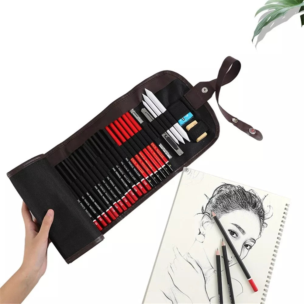 Profesionalus 36 dalių pieštukų ir piešimo reikmenų rinkinys su stilingu susukamu dėklu – tobula dovana kūrybiškumui!