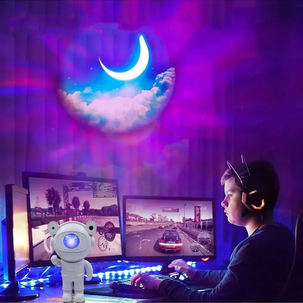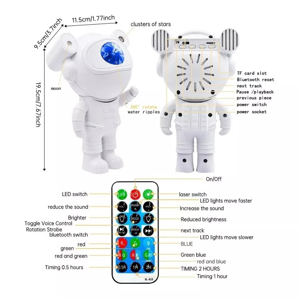 Neįprastas astronauto formos LED žvaigždžių projektorius. Integruotas lazeris leidžia projektuoti žvaigždes ar galaktikas net 8 pavidalais. Besisukanti galvutė (360 laipsnių) leidžia projektuoti plačioje plokštumoje ir dideliu atstumu. Galima reguliuoti šviesos diodų ryškumą, sukimosi greitį ir veikimo laiką. Patogus IR nuotolinio valdymo pultas leidžia lengvai nustatyti projektoriaus žmogų iš toli. Dėl patrauklaus dizaino ir daugybės nustatymo galimybių tai puiki dovana vaikui.