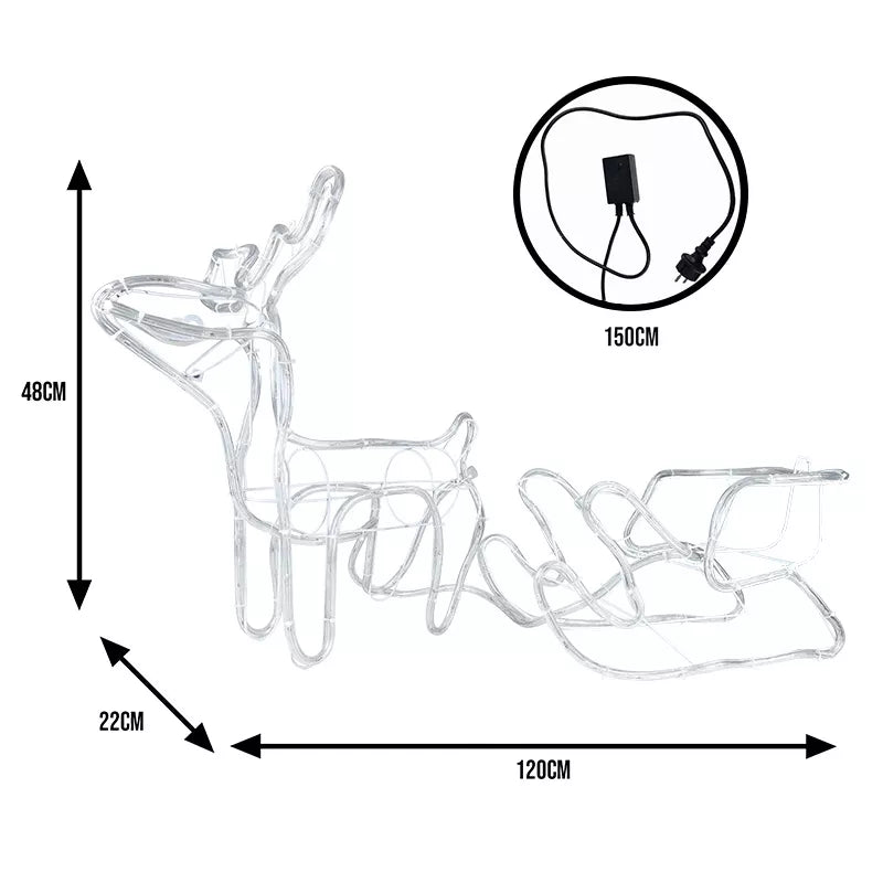 Sukurkite tikrą kalėdinę pasaką savo namuose ar kieme su šia įspūdinga LED elnių ir rogių dekoracija! Tai elegantiškas, iš šviesos laido pagamintas švytintis akcentas, kuris suteiks jūsų aplinkai šilumos, šventiškumo ir žiemos stebuklo nuotaiką.