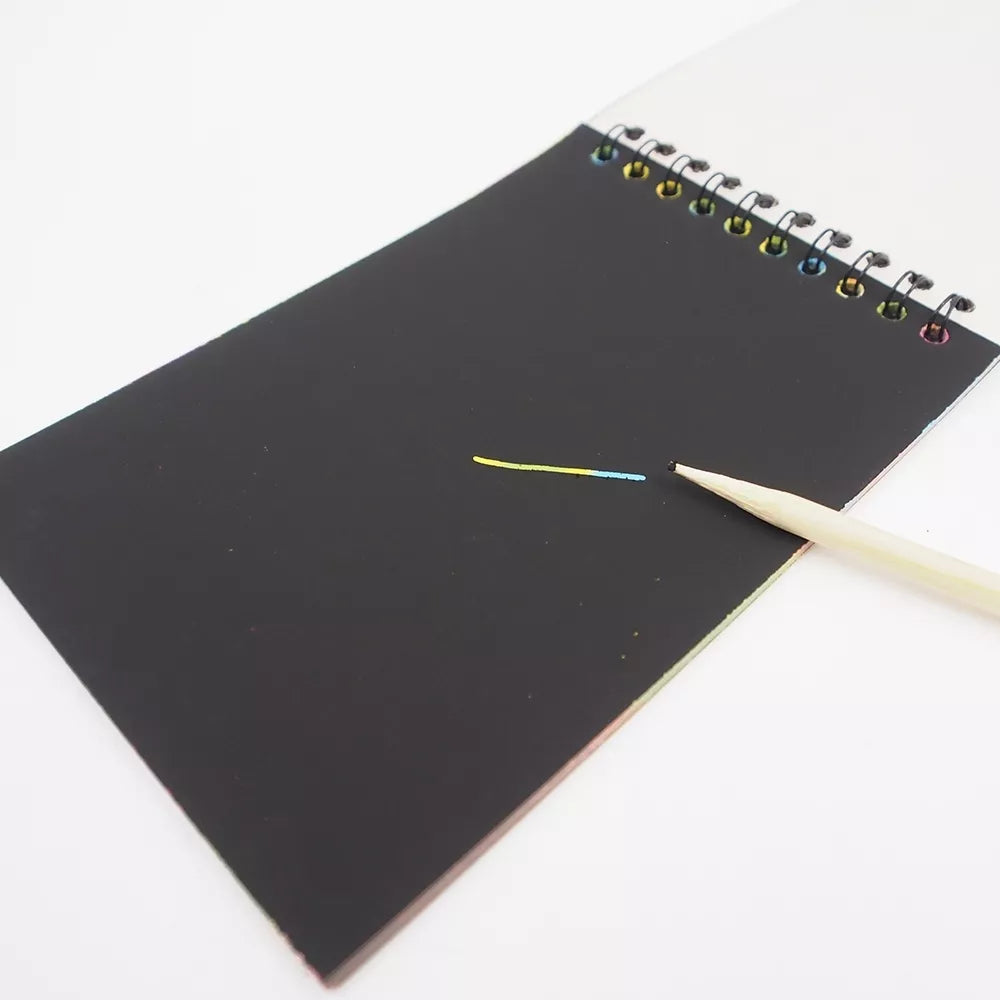 - Naudokite medinį pagaliuką, kad nubrauktumėte juodą matinį popieriaus paviršių, atskleisdami ryškias vaivorykštės spalvas!