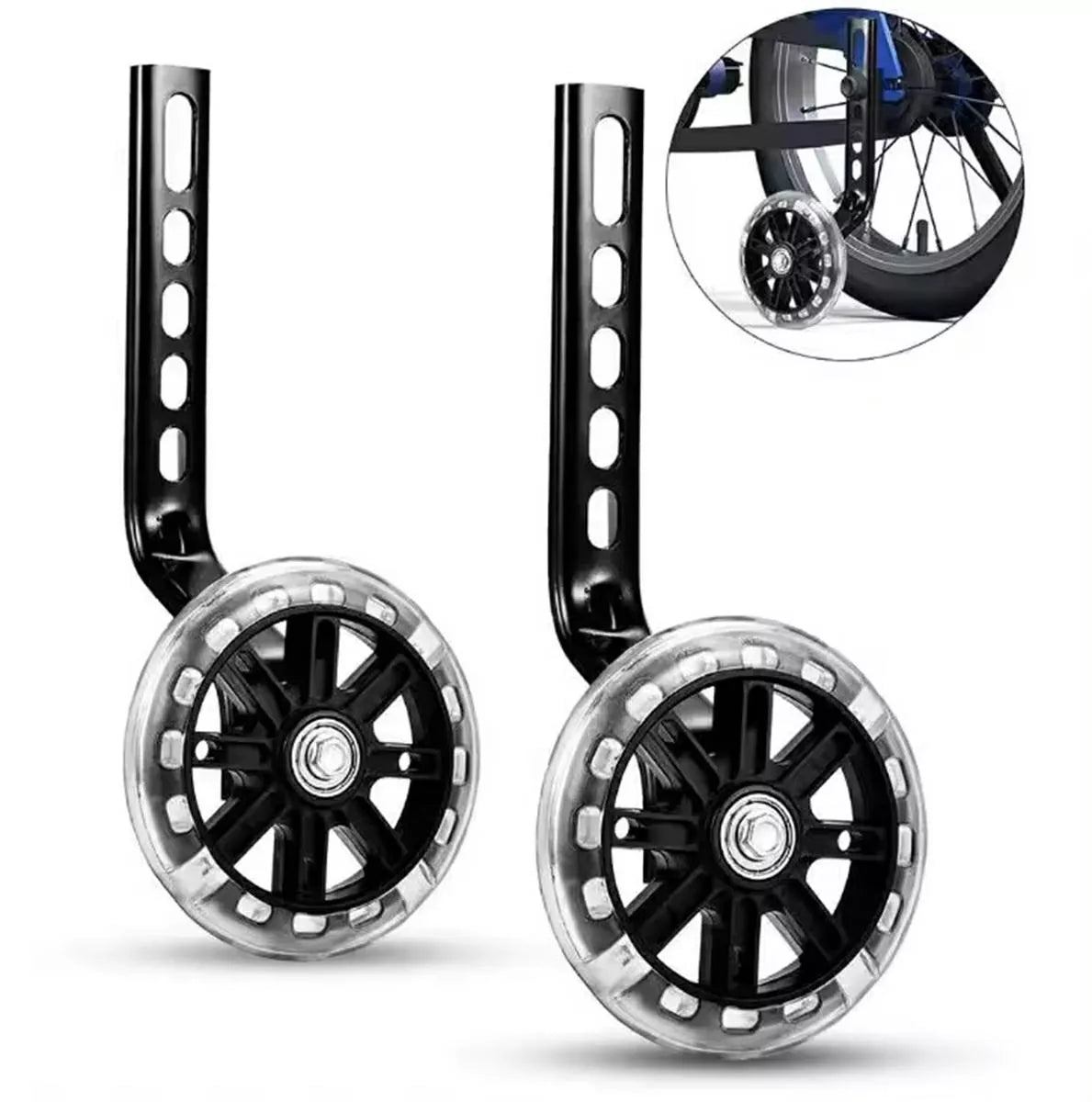 Dviejų šoninių ratukų komplektas vaikiškam dviračiui. Jie užtikrina stabilų ir saugų važiavimą dviem ratais. Jie padeda lengviau išmokti važiuoti dviračiu nerizikuojant apvirsti.