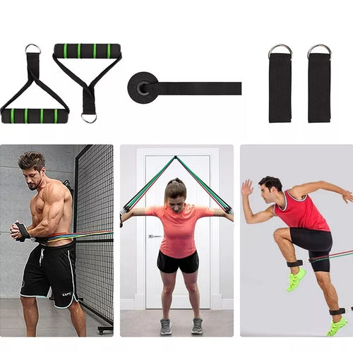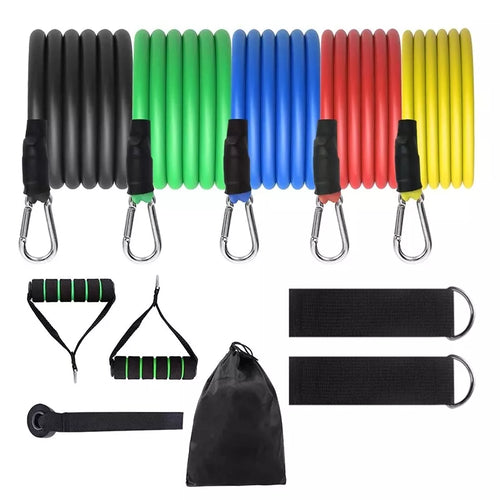 Pasipriešinimo gumų komplektas su laikikliais sportui bei reabilitacijai. Tinka apšilimui, įvairaus sudėtingumo treniruotėms namuose, lauke ar sporto salėje. Patogus bei paprastas gumų jungimas karabinais užtikrina saugumą bei patikimumą treniruočių metu.