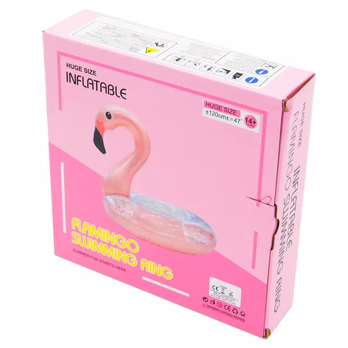 Pripučiamas plaukimo ratas flamingas su blizgučiais viduje