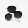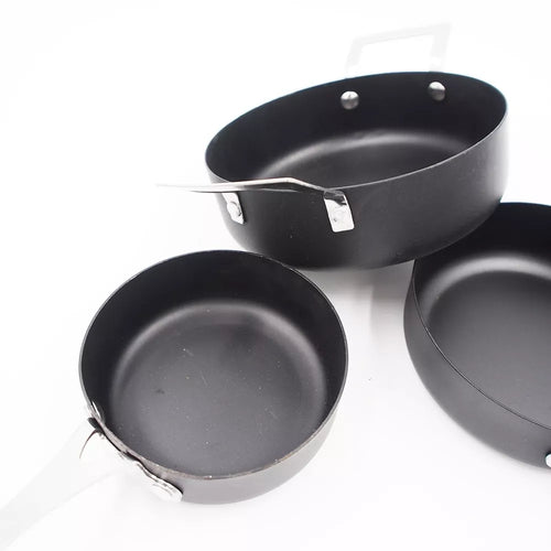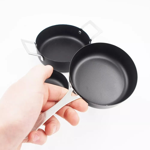 Mini turistinių kepimo indų rinkinys. Dvi mažos keptuvės ir dubenėlis puikiems pusryčiams išvykose.