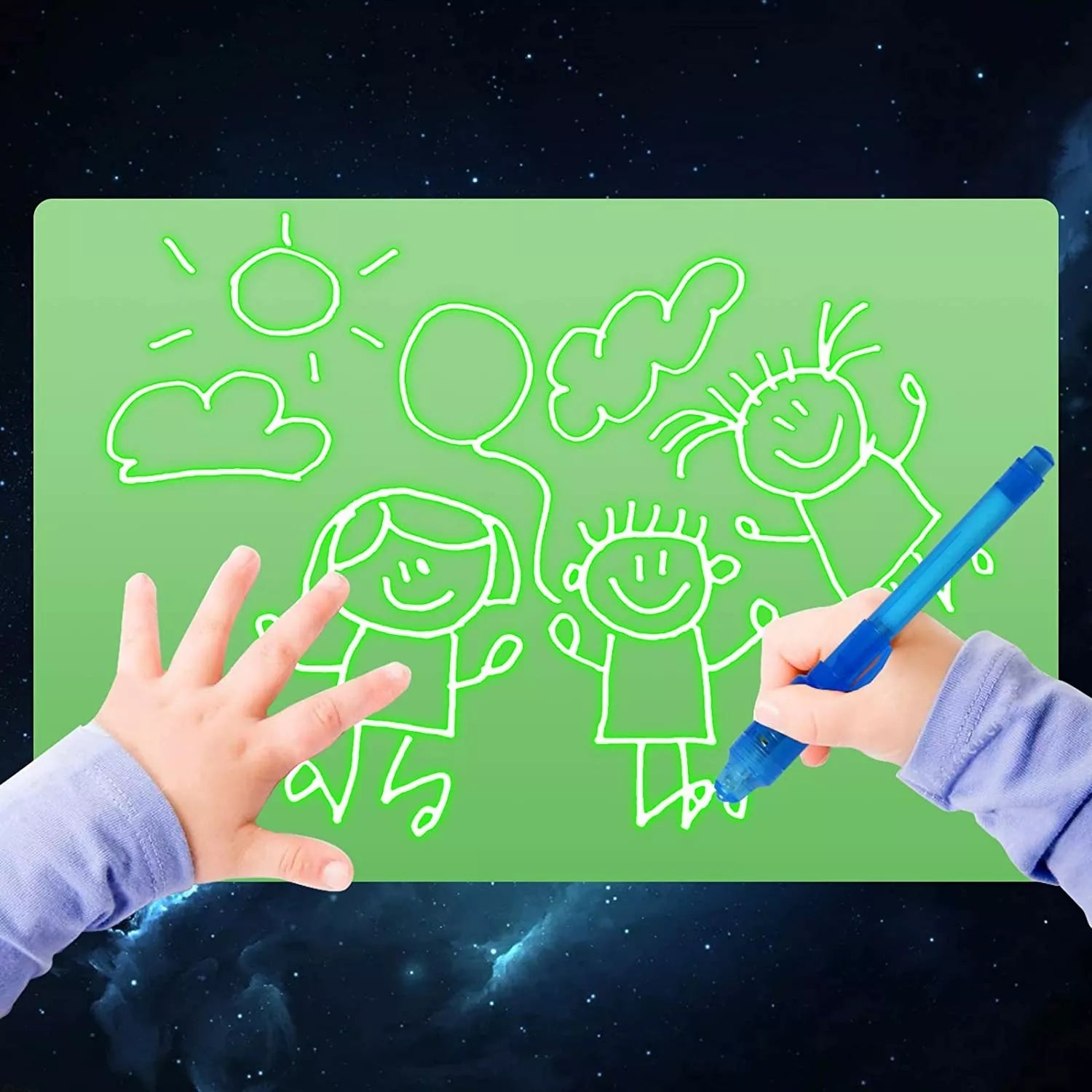 Paimkite lentutę kuri padengta šviesą kaupiančia danga, žymeklį (šviesos pieštuką) ir pradėkite piešti!